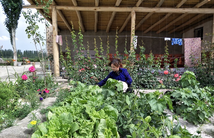 米吉提·艾力是拜城县大桥乡英买里村2组一名侍弄庄稼的好手,他原本是塔城人,年轻时在此务工邂逅了现在的妻子热亚娜木·吾热依木,拿他的话说:“我一见到她嘛,就喜欢上了,为了她嘛!我留下来了”。米吉提是一个性格开朗热爱生活的人,平时就像疼自己的女儿一样的疼爱着自己妻子,因为自己工作忙,又舍不得妻子劳累,就把家里仅有的14亩土地流转出去了,但是他又是个闲不住的人,为了给妻子一个好的环境,就成天谋划着要拾掇家里的院子,为此他多次找上了大桥乡英买里村2组的访惠聚工作队员,帮着给他谋划。