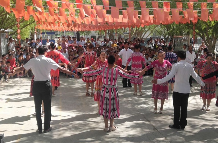 近年来,党和政府出台了系列扶持政策,不断加强对繁荣和丰富农民文化生活的支持,驻村工作队年初有了计划,转变宣传方法、创新宣传模式,使村民在搞好自己家庭经济发展之余,利用空闲时间,把酷爱文艺的农民们组织起来,组建了全村87人的文艺队。正赶上“肉孜节”和“端午节”来临,上演了一场乡土味浓郁的“节日文化大餐”。“以往村民只看别人表演,如今不仅可以近距离观赏,还可以亲身参与其中,村民们以后文化生活更丰富了。”村妇女主任吾格来木·阿不都热合曼难掩兴奋的说。
