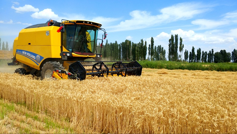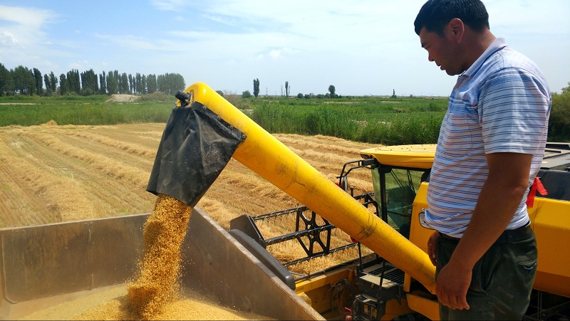 清风网讯 (通讯员 库车县文广局 张晓丽) 库车县哈尼喀塔木乡29700亩小麦,颗粒饱满,喜获丰收,为了更好的完成小麦收割任务,哈尼喀塔木乡农机站积极调配纽荷兰大型联合收割机助力小麦收割,6月19日,在琼协海尔村工作队员的积极协调下大型收割机开到了琼协海尔村艾合买提·买克木提家的小麦地里,打响了哈尼喀塔木乡小麦收割战役第一仗。琼协海尔村630亩小麦预计四天可收割完毕。村民艾合买提·买克木提高兴的说“我家今年种了35亩小麦,工作队帮我们联系了收割机,2个小时就收割完了,我们现在就可以回家扬晒等着夏粮收购了。”乡长阿不来提·依明介绍说“哈尼喀塔木乡地处塔里木河流域边缘,独特的地理位置,享有库车粮仓的美誉,29700小麦预计可产粮食13350吨左右。