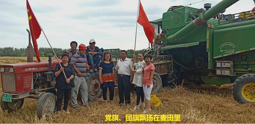 鲜艳的党旗、团旗飘扬在吾斯曼·达尼西家的麦田里,有党旗飘扬的地方就有我们驻村干部、党员、村干部忙碌的身影。