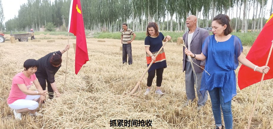 清风网讯(阿瓦提县妇幼保健院 刘华)哪里有困难党旗就插到哪里!阿瓦提县多浪乡赛克孜奥塔克村1组贫困户吾斯曼·达尼西家中劳动力少,6月20日看着天气在变化又要下雨啦,地里的麦子不能及时收回来,吾斯曼·达尼西焦急地找到工作队请求帮助。第一书记米克热古力·吾买尔立即联系了收割机,并组织工作队队员、村干部来到吾斯曼·达尼西的麦田,帮助收割小麦。村党支部书记艾买尔·依明就是农业专家,查看收割机的收割情况,现场指导讲解。阿瓦提县县妇幼保健院驻多浪乡赛克孜奥塔克村工作队的6名女队员搬麦草、装车干劲十足,流着汗笑容却格外的灿烂。