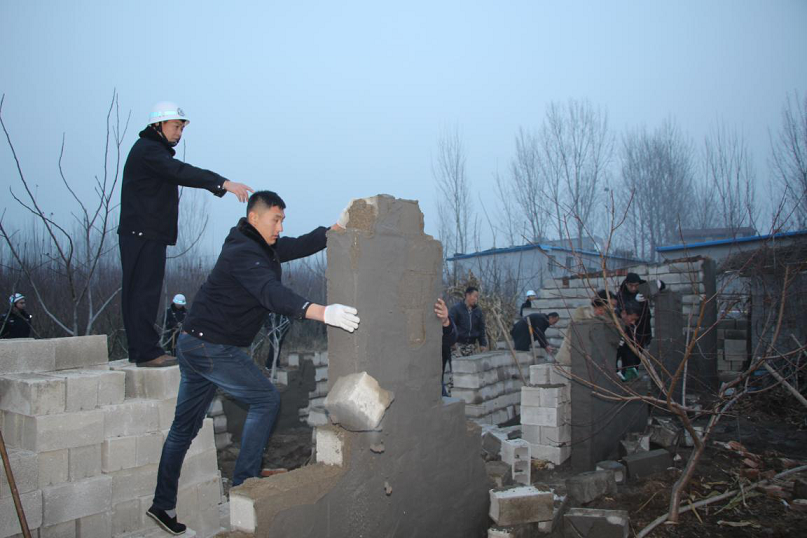 图为在泰安高新区综合行政执法局局长张大山同志(右二)带领下,徐光志同志(右一)在违法建筑现场执法。