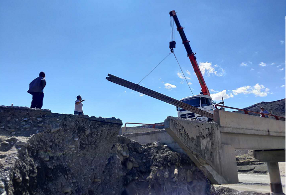 抢修库孜翁村交通,起吊钢轨铺设便民桥。