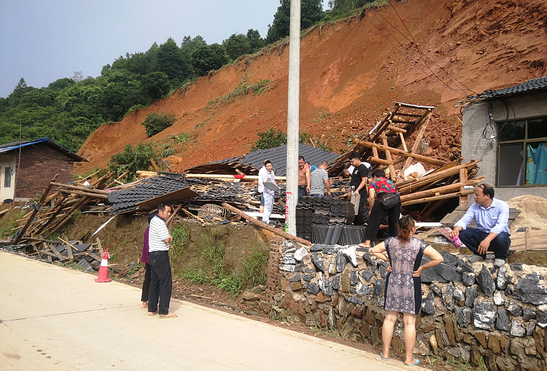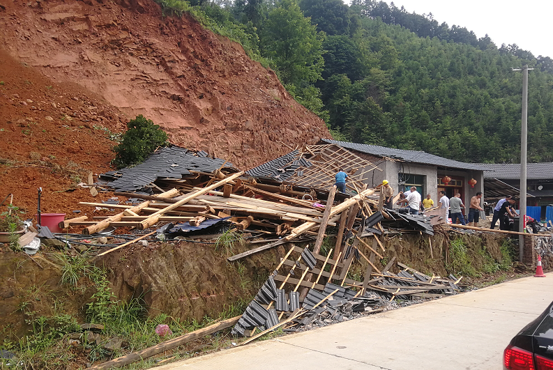 原来是2018年6月21日下午,家住绥宁县长铺子苗族侗族乡游家村陶家界组的陶声国家宰了一只鹅,按照苗乡习俗,邀请了亲朋好友共11个人来家一块儿喝米酒凑热闹,大约在晚上7时20分左右,大伙正喝在兴头上,有个叫杨进北的苗古佬听到屋后面响声异常,急忙打开后屋门察看,发现后山的山体正在往下移动,还伴发出嗡隆隆的响声,因为他前年参加过村里组织的防灾减灾应急演练,立即意识到这是典型的因为连日暴雨导致的山体滑坡特征,听响声滑坡面积肯定很大,随立即大喊“大家快往屋外跑!”,并马上带领全部人员跑到了屋外的马路上,前后不到5分钟,整个一栋4排3间的二层楼木房就被大面积的垮方冲毁压埋,由于跑得及时,没有发生人员伤亡。