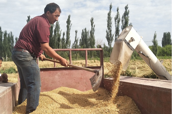 孜日排母·努肉孜是该村的贫困户、低保户,而且目前已经70岁,家中还有一个患有精神疾病的女儿,家中没有劳动力,今年种了3亩地小麦,无法收割,老人召集的像热锅上的蚂蚁,工作队得知此情况后,第一时间将收割机开到老人家的地里,一会的功夫就收割完了,老人家激动的说:“热合曼提·热合曼提,工作队太好了,谢谢你们。”