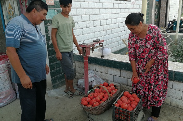 进入7月下旬,库如勒库木村57户贫困户种植的60亩优质番茄进入了成熟期,总产量近30吨,可是大量的番茄却遭遇了滞销,种了2亩番茄的赛买提·依明急得团团转。驻村工作队得知消息后,主动联系巴州的客商帮助农民找销路,客商指定本村带领农民创市场的经纪带头人阿布拉·艾克库力作为中间商优价收购,这下村里滞销的大批量番茄全部找到了销路。
