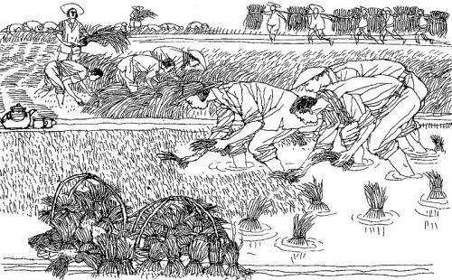 昨天收割的稻谷,还有没有挑回家的,母亲是个急性子,她和父亲两又准备翻整一块田出来插秧了,母亲本来就个子不高,因为淤泥深,母亲挑着的担子基本就在水田表面上拖着了,担子总是比母亲个子还高,扁担在她肩膀上挪来挪去的,便可知道那担子的重量。水面都开始发烫了,手臂也被晒的红通通了,风也感觉停止了,很多人陆续收工回家了,母亲又送来了一担秧苗,“插完了回家吃饭,不插完的话这些秧苗都会晒死的。”等到我们插完,基本外面早已经没有其他干农活的人了。