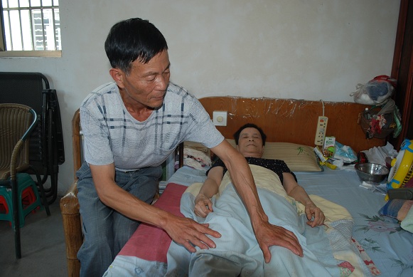 由于常年瘫痪在床,又经常大小便失禁,叶爱娟的皮肤发生了溃烂,张建浩就耐心的给她擦洗身子,涂药膏、药水,从不嫌脏和臭,尽管他的左手已逐渐丧失了劳动功能。