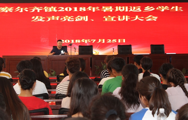 清风网讯(察尔齐镇人民政府 郭世浩 )为增强返乡学生民族团结意识和维护社会稳定的主动性、积极性,激发学生心系家乡、热爱家乡、为家乡建设贡献力量的热情,2018年7月25日,察尔齐镇党委组织各村返乡大学生、内初班、内高班及内职班,两后生,高三毕业生等200余人在察尔齐镇巴扎村会议室参加“谁是我们身边的敌人,谁破坏了我们的幸福生活”为主题发声亮剑大会。察尔齐镇文教党组织书记吐尔洪·阿布拉主持,察尔齐镇党委委员、宣传干事如仙古丽·米吉提参加。