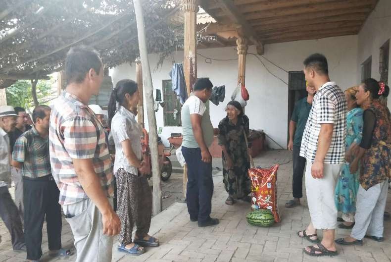 第一书记柳顺杉及大队书记罗合曼·托合提带着全村38名党员对两位老人分别进行了慰问,送去价值500元的慰问品。