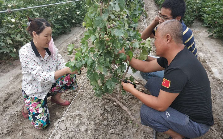 2018年7月27日下午,工作队再次来到本村村民梁渊的葡萄园,就如何提高葡萄的品质,和村民进行了探讨工作队,针对每一个问题结合实际情况向他们进行了解答,并手把手的教会他们这些技术,确保今年葡萄能有一个好的产量和价格。