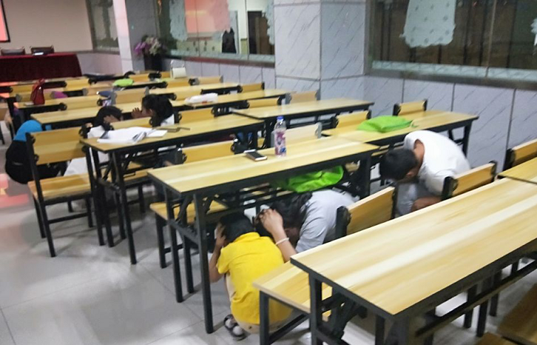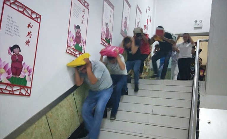 晚上9:55,突然听到有人说“地震来了,正在会议室学习的居民听到地震来了,有的人都用手抱着头蹲在桌子底下,用双手护头。”有的人按照疏散逃生路线往楼下跑,大家用手护头,低身弯腰,靠右扶墙,井然有序往楼下规定的地点跑去。集合时大家抱头蹲下,等待清点人数。