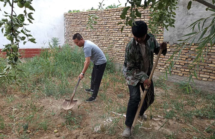 胡清书记边干着活边说:“你们一家人都在很努力的生活,我们是看在眼里的,儿子艾沙·坎吉小时候因被翻土机撞过头被鉴定为零级精神病患者,但他对生活充满信心,国语水平不错可以跟我们简单的交流,他平时还会就近务工挣钱补贴家用,这些都是作为村里年轻人值得学习的,希望你们继续努力生活,改变现状,过上更好的生活”。