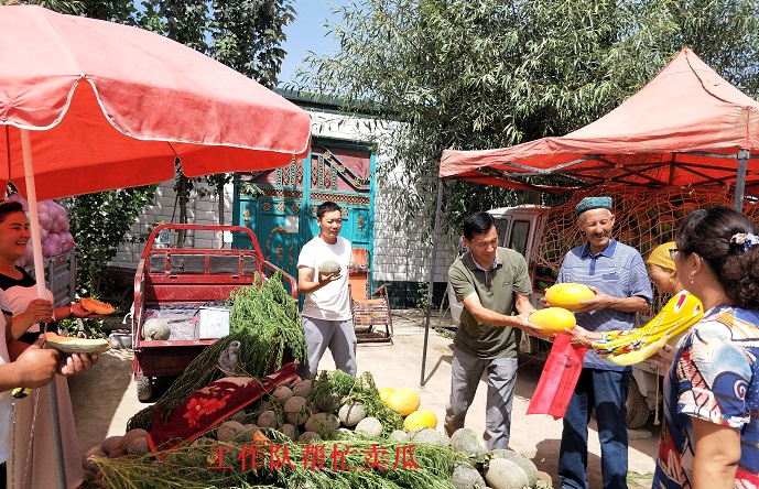 工作队队长王江平说:“连日来,沙雅县的气温都在35摄氏度以上,这几天,我们都起得很早,既要帮着农民摘瓜、装瓜,还要跟着三轮车把甜瓜送到巴扎上,帮着农民一起销售,找销路。