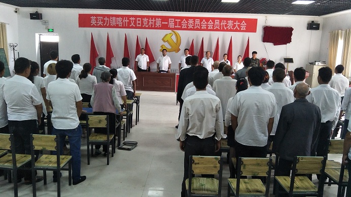 升国旗仪式结束后,喀什艾日克村第一书记、村党支部书记、村委会副主任和工会会员共42人参加会议。大会由第一书记阿依甫·依米尔主持,在雄壮有力的国歌声中拉开序幕。