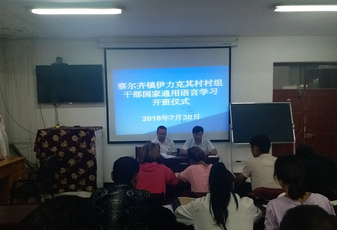 清风网讯 (中国电信拜城分公司 张进东)2018年7月30日,伊力克其村驻村工作队举办的“国家通用语言培训班”在伊力克其村村委会正式开班。开班会上伊力克其村包村领导伊布拉音·艾力出席了开班仪式并做动员讲话,村党支部书记阿布都肉苏力·艾沙主持。按照县委组织部、镇党委的要求,村“两委”班子成员、村民小组长、副小组长、村组后备干部20余人参加。