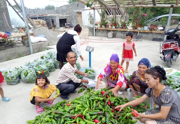 依米提·扎依提一家正在分装辣椒,分装好的辣椒将运往阿克苏地区农业局。