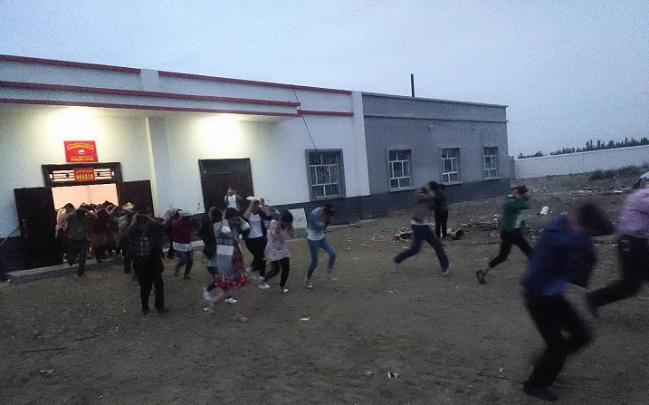 村民跑出服务中心紧张有序开展应急避灾疏散