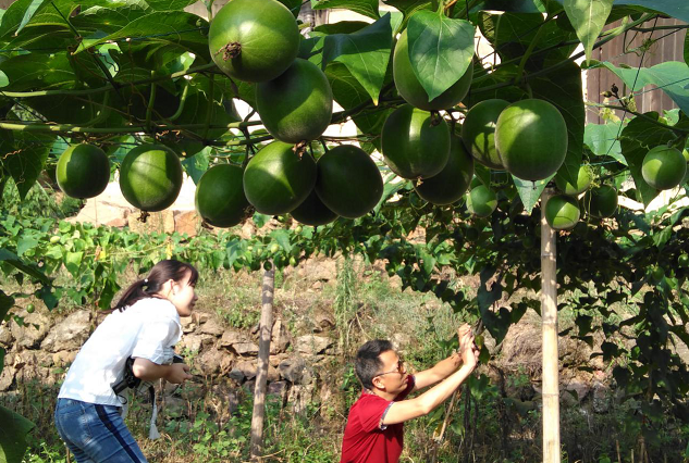7月30日,邵东环保局驻省级贫困村佘田桥镇荷公殿村扶贫工作队队员在该局产业扶贫项目罗汉果种植基地察看挂果情况。该基地今年试种罗汉果50亩,挂果形式喜人,预计今年可收入40余万元,党旗下山区种出了致富果!