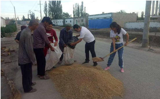 清风网讯 (中国电信拜城分公司 托乎尼亚孜·吐尔逊)拜城县电信公司驻察尔齐镇伊力克其村 “访惠聚”工作队怀揣着对党忠诚、为民服务的赤诚之心,脚踏实地践行党的宗旨。7月31日,乌云满天雷雨即将来临,察尔齐镇伊力克其村1组72岁艾尼·艾来克正在吃力的收麦子,恰巧被正在入户走访的工作队副队长托乎尼亚孜·吐尔逊、小队长克热木塔依尔,下沉住户干部于文雅遇到,二话不说“撸起袖子”帮助老人家收麦子,路过的群众也纷纷来帮忙,很快十几袋小麦子整整齐齐排好队,等着进粮库,老人家再也不担心收获的麦子淋在雨里。
