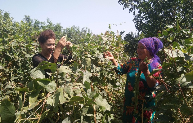 古海尔汗·乃麦提家中有一亩五分地的菜园,家中劳动力少,收入来源单一,工作队队员如孜古丽·拜克力得知情况后,就鼓励她发展庭院经济,种植时令蔬菜,养殖家禽,并主动帮助她寻找销售渠道。每周古海尔汗·乃麦提都会将采摘好的新鲜蔬菜打包,菜贩子上门收购。如今古海尔汗·乃麦提在家门口就能卖菜,从7月到现在,短短一个月,就已经销售新鲜豇豆1000公斤,收入1500元。