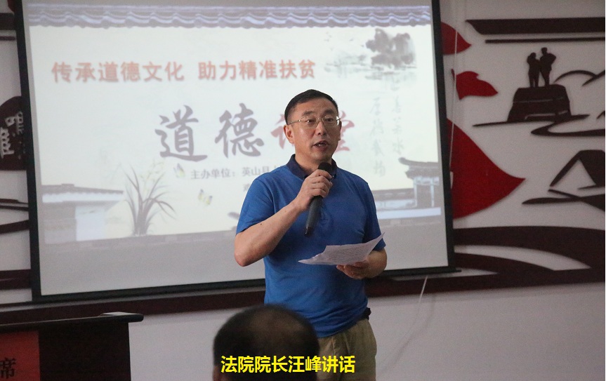 本报网讯(通讯员 童曙明 王思淼)8月2日,湖北英山县人民法院和扶贫扶贫联系村---英山县方家咀乡鸡鸣河村联合举办的以“传承道德文化、助力精准扶贫”为主题的道德讲堂活动在鸡鸣河村隆重举行。县法院院长汪峰、乡党委书记段水平、法院副院长丁卫东、审判委员会专委龚剑,及法院全体帮扶干部、贫困户代表共200多人参加。