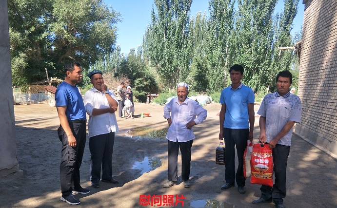 清风网讯 (阿克苏地区“访惠聚”办公室 常盼)村第一书记、工作队队长赛麦提伊斯马伊力说道,2018年8月1日是“建军节”,是一个非常喜庆的日子,今天就在这个喜庆的日子里,我们应该去走访慰问自己的结亲户,使得他们时刻要能体会到我们对他们的关怀与照顾。