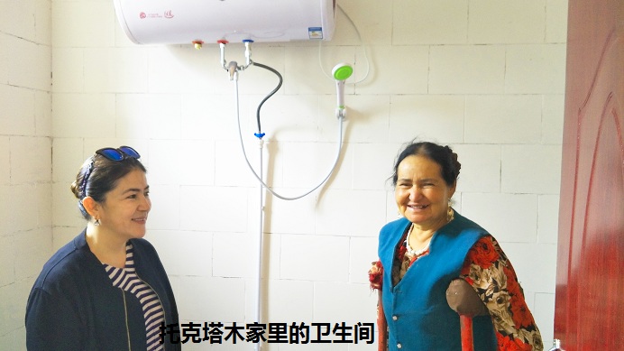托克塔木·阿布代克今年58岁,患腰椎骨结核靠双拐辅助行走,家庭经济困难。根据她家的实际情况,工作队和村委会决定在鼓励她发展经济的同时,帮扶她把安居房建起来,并帮助其新建卫生间,安装了马桶,建设了三格式化粪池。