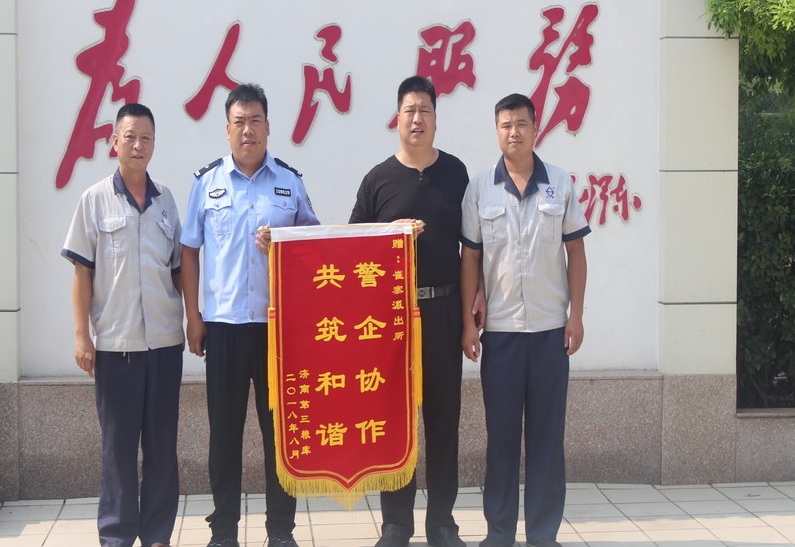 8月3日上午,济南第三粮库负责人将一面印有“警企一家,共筑和谐”的锦旗送到了崔寨派出所,对崔寨派出所为第三粮库收粮食期间维持良好的秩序表示感谢。