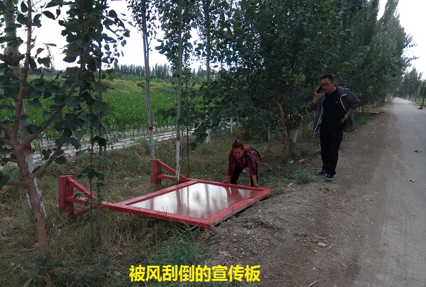 “艾力·卡迪尔,小巴扎对面的两块宣传板被风刮倒了,你马上找个三轮车来拉到村委会院子里去,不要被孩子们上去玩踩坏了,明天装好还能用呢”。“吐尼牙孜·曼苏尔,棉花加工厂边上有一棵杨树被风刮倒压在了电线上,你赶快带人过来把树拿走,时间长了把高压线压断就麻烦了”工作队副队长刘新龙对发现隐患点进行应急处理。