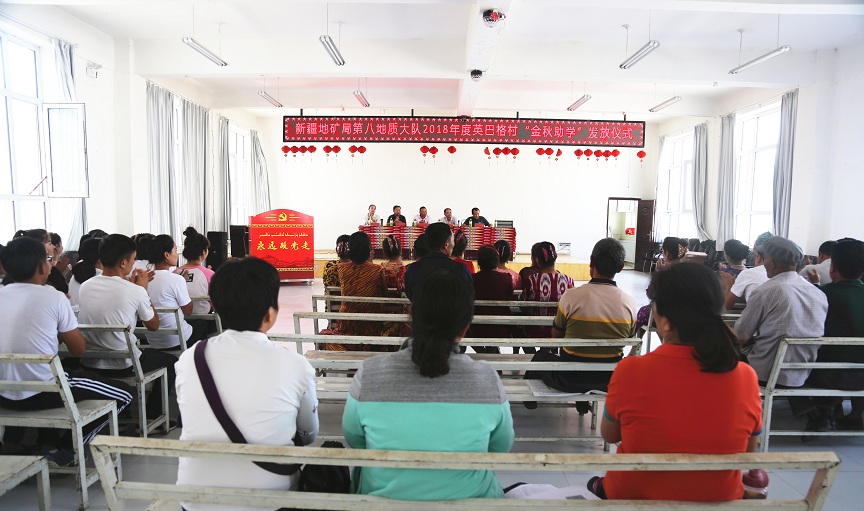 8月25日,本着“资助一个学生,温暖一个家庭,播种一个希望”的宗旨。在驻村工作队派出单位新疆地矿局第八地质大队的大力支持下,在英巴格村村委会隆重举行了2018年度“金秋助学金”发放活动。活动一开始,派出单位领导李胜伟发表了讲话:“他希望在做的每位学生都能树立远大抱负,坚定理想信念,要做一个自强不息的人,一个懂得感恩的人。要把党和政府的深切关怀、新疆地矿局第八地质大队真心关爱转化为感恩社会立志成才的强大动力。”