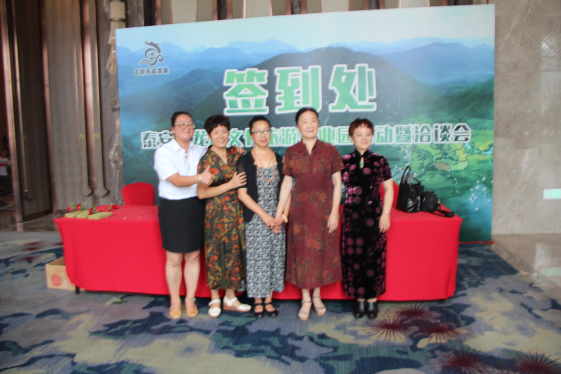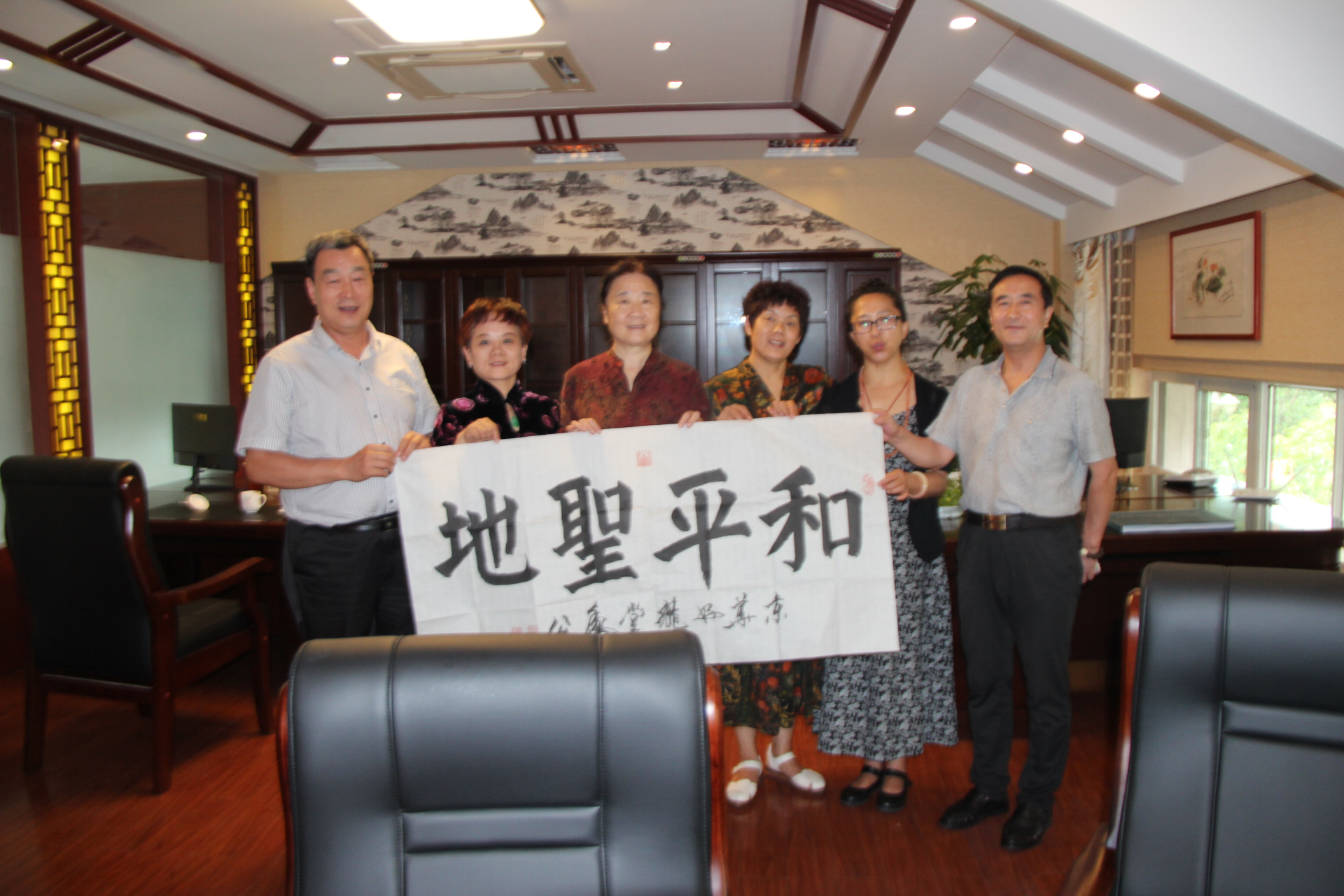 图为峡两岸和平事业投资贸易促进会会长李桂玲女士(右二),秘书长戚忠建先生(右一),与泰安天成龙脉园林景观有限公司董事长苏岩广先生(左一)等领导合影。韩庆全摄