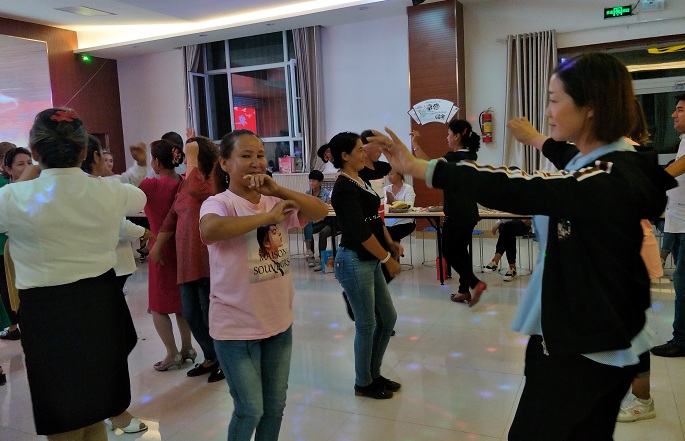 在座谈会结束后,3组的乡土人才布尼牙孜汗·达依木和弟媳妇海尼萨汗·吐尔逊拿着多它和手鼓给大家弹唱起了欢快冗长的维吾尔族长调,亲戚们也自发的站起来邀请结亲干部们一起跳起了麦西来甫,大家面带笑容,目光对视,随着音乐有节奏的摆动着手臂,忽而转身,忽而错步,感情在不知不觉加深,距离在不知不觉拉近。在一阵节奏明快的音乐声中, 1组小组长米吉提·艾力垫着鸭子般的步子、轻摆着胯部在场中跳起了诙谐、幽默的舞蹈,随着他的邀请,一群妇女们纷纷上场围着他跳了起来,整个把联谊活动推向了高潮最后,亲戚们纷纷给结亲干部们送上了自己精心准备的礼物,希望通过这种方式表达对结亲干部的谢意,加深彼此之间的感情。