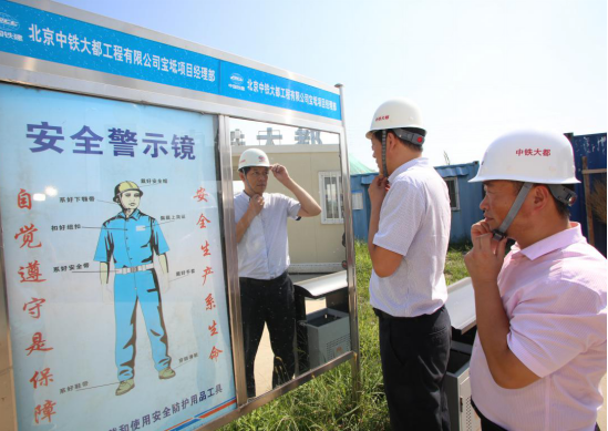 中铁十八局集团大都公司宝坻项目部通过设置安全警示镜提醒大家正确使用安全防护用品工具