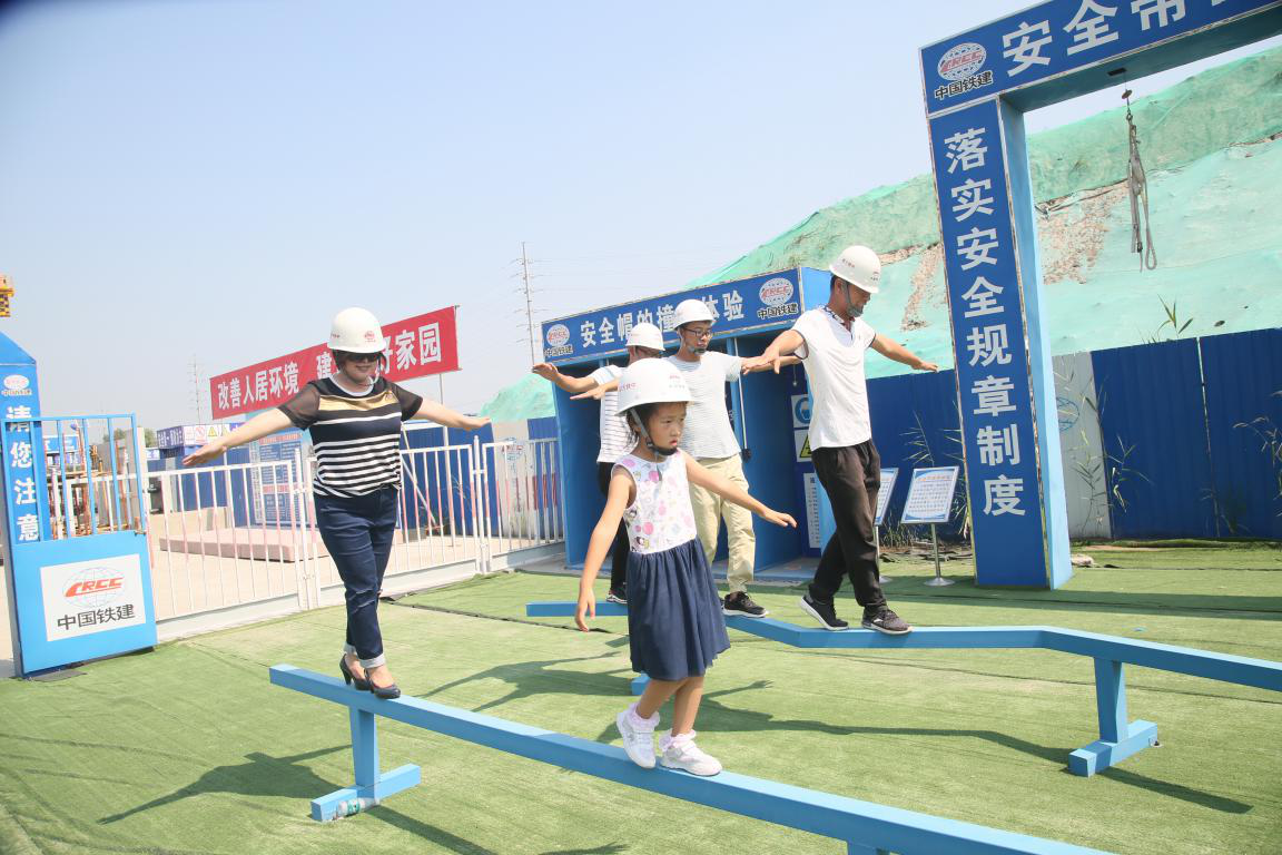 中铁十八局集团大都公司宝坻项目部探亲的家属、孩子和新学员在安全体验馆体验平衡木