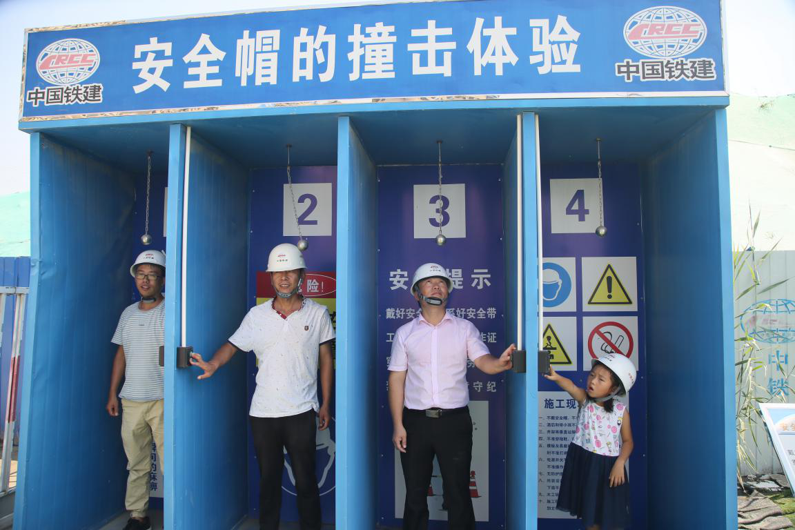 中铁十八局集团大都公司宝坻项目部探亲的家属、孩子在安全体验馆体验安全帽撞击