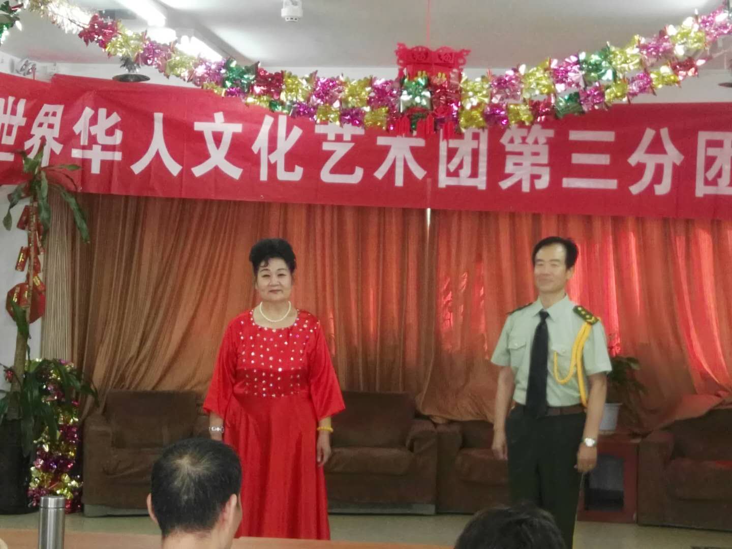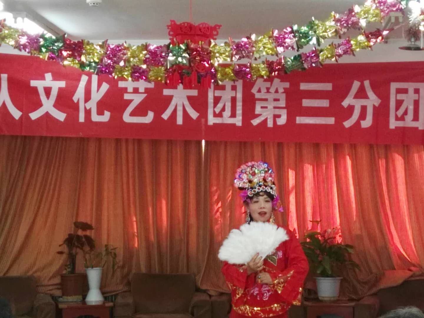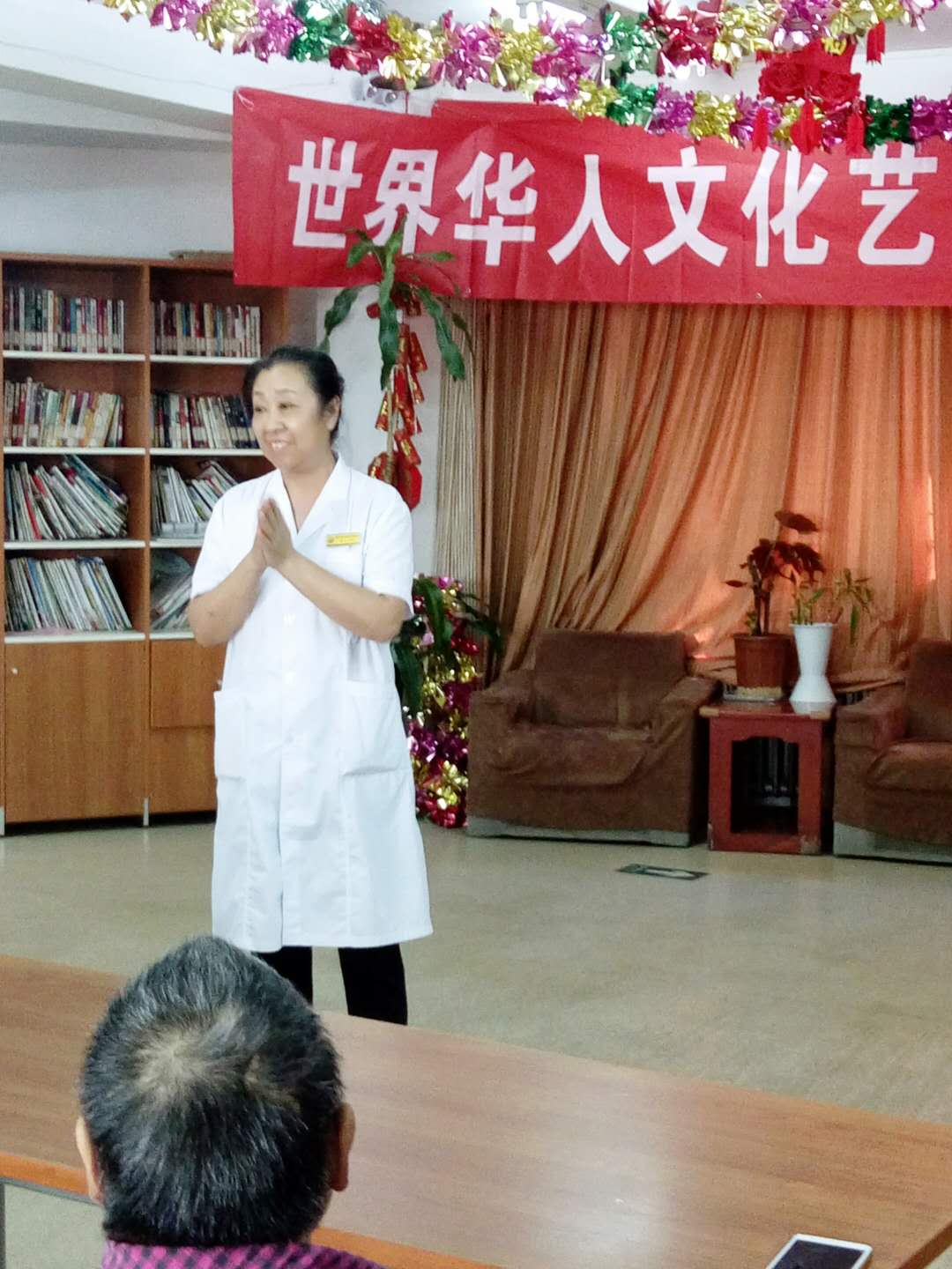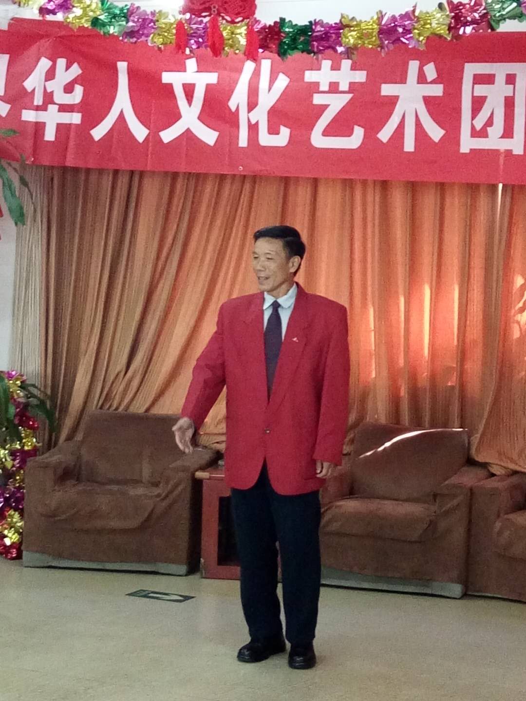 下午两点开演,还不到两点,老人们陆续进入演出会场。会场内播放团歌:祖国大中华。老人们个演员们亲切交谈。时间到两点半,主持人:王一斌,董力军走上台宣布演出开始。首先:展览路街道养老照料中心的李院长致欢迎词:欢迎:世界华人文化艺术团第三分团来我院演出。世界华人文化艺术团第三分团的团长张颖上台讲话。张颖简单地做了团的介绍:并祝老人们笑口常开健康长寿!