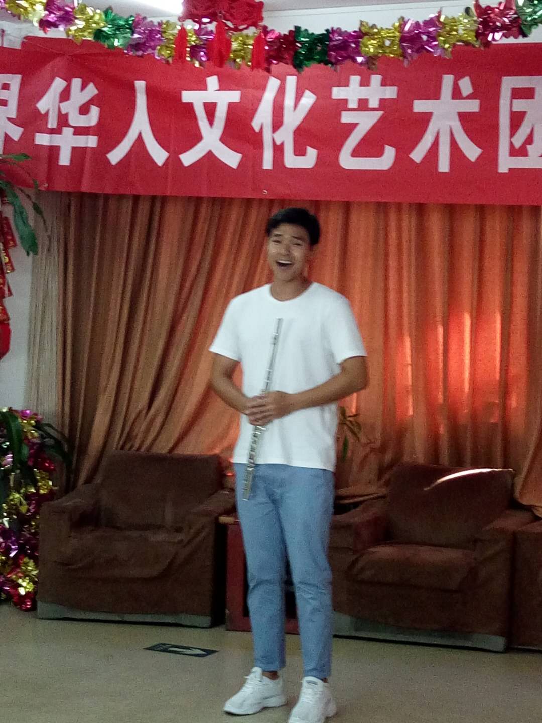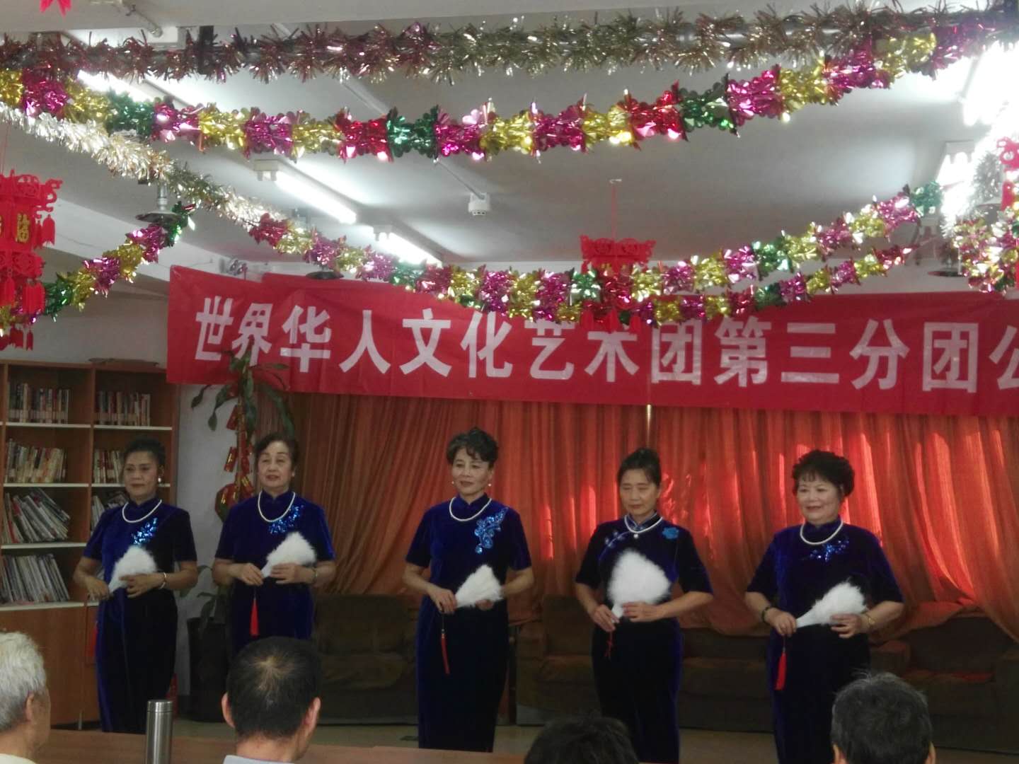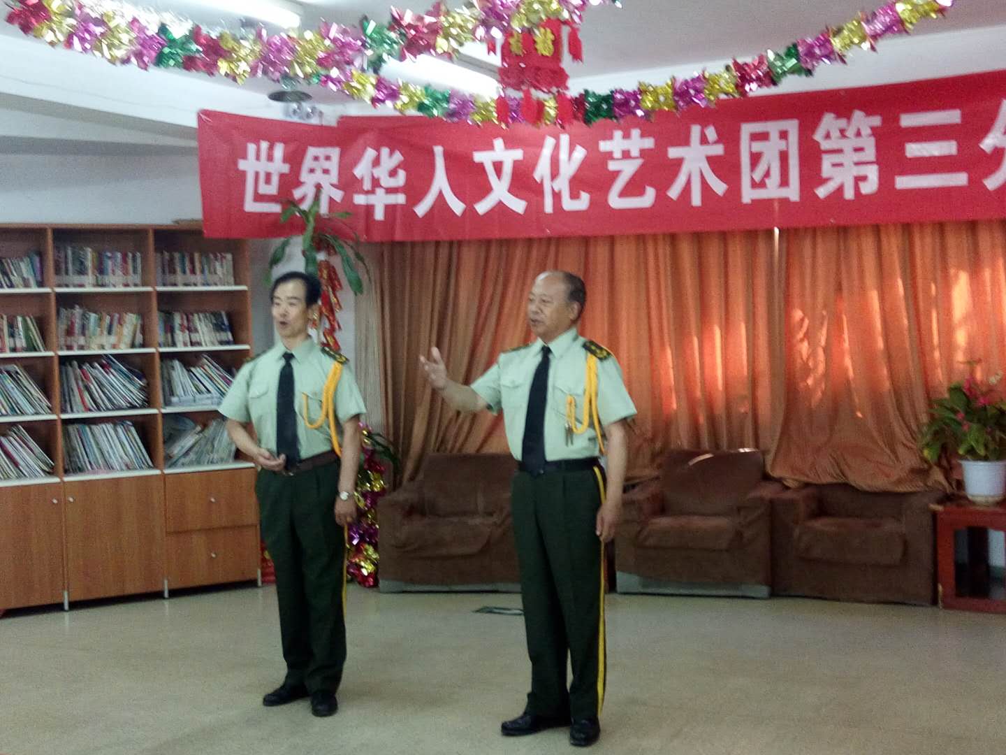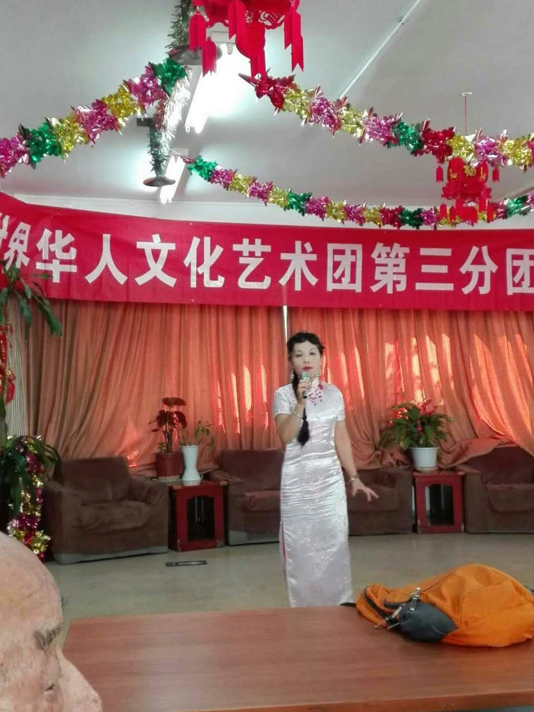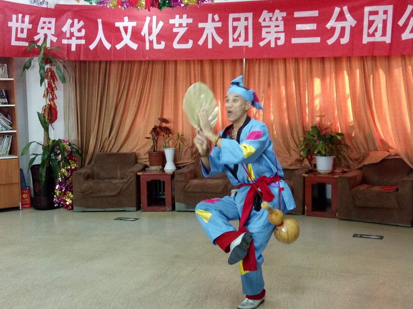 下午两点开演,还不到两点,老人们陆续进入演出会场。会场内播放团歌:祖国大中华。老人们个演员们亲切交谈。时间到两点半,主持人:王一斌,董力军走上台宣布演出开始。首先:展览路街道养老照料中心的李院长致欢迎词:欢迎:世界华人文化艺术团第三分团来我院演出。世界华人文化艺术团第三分团的团长张颖上台讲话。张颖简单地做了团的介绍:并祝老人们笑口常开健康长寿!