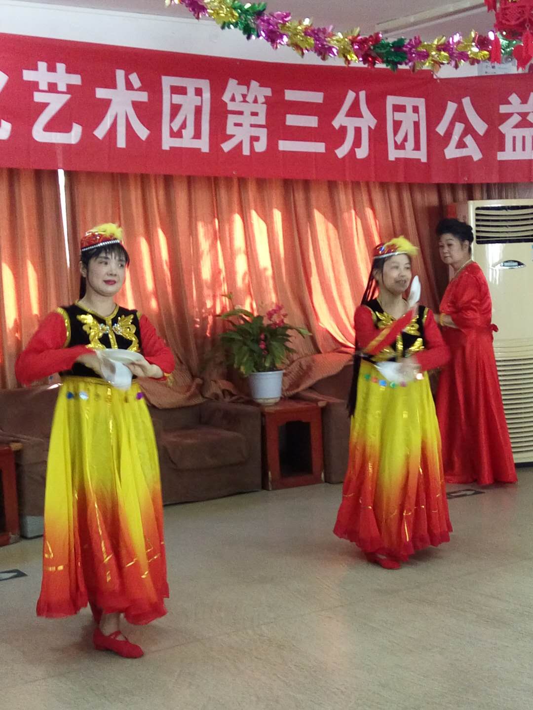 第一个节目是孙国庆领舞的新疆盘子舞。舞姿优美,活泼,显示出少数民族的新疆姑娘对生活的热爱。刘晓滨演唱了拉着妈妈的手,,边唱边和老人们互动,星光大道获奖选手孙越演唱了:桃花依旧笑春风博得了观众们热烈掌声。董力军演唱了:西沙我可爱的家乡,唱出了中华儿女对祖国边疆的热爱。李秀全演唱了:江山无限,表演了小品:济公,动作幽默,滑稽,观众爱看,掌声不断。张颖演唱了歌曲:月满西楼,古装的扮像起了画龙点睛的作用,韩凤君演唱了祖国我永远热爱你,当那一天来临,演唱者是:李中伦,李士杰这对儿黄金搭档唱得铿锵有力,唱出了中华儿女爱祖国,爱人民的豪迈气派。郭常印演唱了西口情,曲调优美。小演员吕文浩只有十岁也参加了演出,演唱歌曲:草船借箭这首歌,最后压轴节目:中国脊梁是王一斌,李中伦演唱的。演出完毕,院里的老人们和演员们合影。最后要求演员们再次开院里演出,演员们表示会常来的。