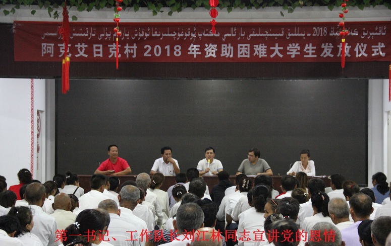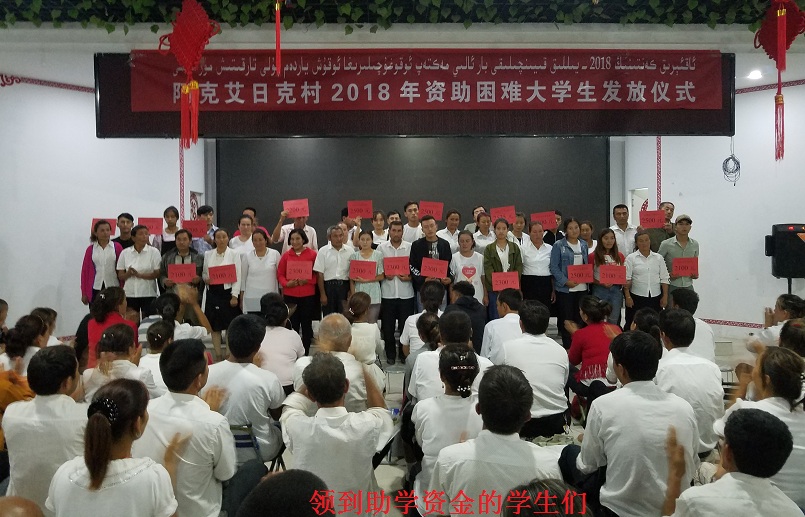 发放仪式上学生阿尔祖古丽·依米提流下感动的泪水做了表态发言,她说到“今年我考上了中南大学医学检验专业,但高达1.2万元的学费我家无法承担,幸好我们村有个“知心”的驻村工作队,他们心中时刻挂念着我们的困难,给困难学生申请了民政、援疆、地区慈善公会等助学资金援助,另外还通过各方渠道募集资金资助我们上学,我们一定不会辜负党和政府的培养,及乡亲父老的期盼,毕业以后好好报效祖国、回馈社会、服务家乡”。