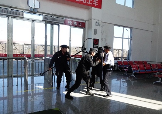 为提高反恐处突最小作战单元应对突发恐怖袭击事件的能力,8月31日,白音华南所组织开展反恐处突演练。民警向警务协勤人员讲解各种警械的使用方法,一旦出现突发情况,应该立即形成作战队形,通过警组配合,利用盾牌、防暴叉将暴恐分子驱赶至候车室角落,并将暴恐分子制服后带离。