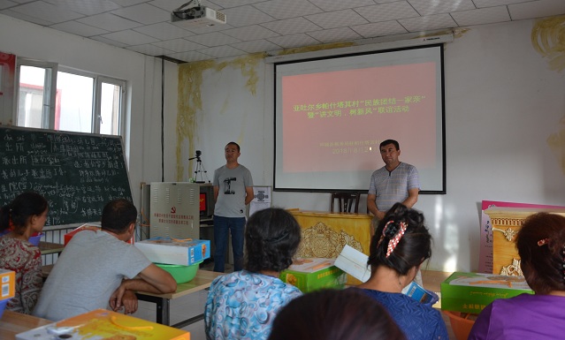 8月29日的下午,大家一一就位,带来了节日尾声的祝福和问候,这次的礼物不仅是村民日常喜爱的砖茶、蜂蜜、饼干等常见物品。我们还分别为每家每户赠送了脸盆、牙刷、牙膏、香皂等洗漱用品。正在群众们感到纳闷的时候,我们将场地转移到了村里的会议室,开始宣讲。副队长阿不来提同志说道:“近期的住户干部们反映,在入户走访过程中,发现很多群众家里的洗漱用品已经旧了,质量也不好。大家的农活又比较忙,没有时间去操心,考虑到这点。这次慰问趁着节日还没有过去,专门为大家准备了崭新的洗漱用品。就是希望大家能够讲文明、讲卫生、树新风。洗漱用品需要定期更换,否则会给大家的健康造成隐患,尤其是对小孩子的身体不好。不注意卫生,生了病可就是省了小钱,却花了大钱。希望大家以后养成良好的卫生习惯!”亲戚们这才恍然大悟,同时也对干部们的细心感叹不已。