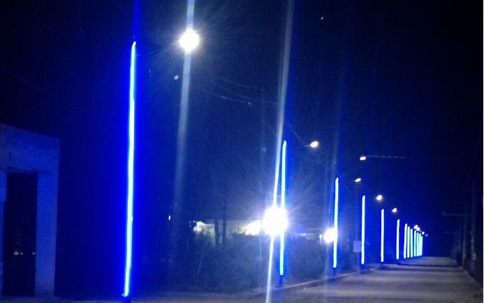 2018年9月3日夜幕降临,小鸟飞来飞去之时,工作队成员阿力木·许克尔和我(王国民)在做完各项工作,去农民家下沉做工作的时候,我们走在村委会的主干道路上,就会发现一片片蓝白相间璀璨的光芒,随着天色的变暗,璀璨的光芒就会越来越发亮,越来越迷人,看起来整个村庄都是明亮的、蓝白相间的,走在道路上你根本就感觉不到漆黑,就好像是走在城市的街道,明亮而繁华。