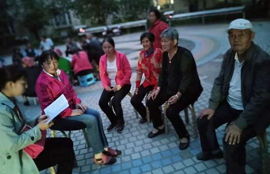 晚上工作队在日新小区中为居民宣讲平安创建知识