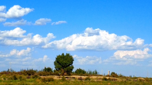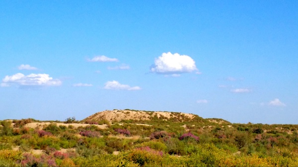 9月6日,琼协海尔村工作队员和遗址看护员徒步走近胡杨迎客、各种沙漠植被环绕的大故城,沿途多为盐碱地,古城墙垣坍塌严重,古城西有高台,南有缺口为城门,一弧形墙垣与古城墙相连环为一座远古城堡,登上城堡眺望,感叹天的尽头那么遥远,伸手可及的朵朵白云却近在咫尺,此时大古城仿佛与蓝天白云促膝对着话,向我们诉说着远古的神秘与悠远,顷刻眼前仿佛呈现如清明上河图般的熙攘和祥和,大故城在今秋与高天流云一同挥洒,留下眼前的美丽景致,让世人追随着历史痕迹畅想未来。