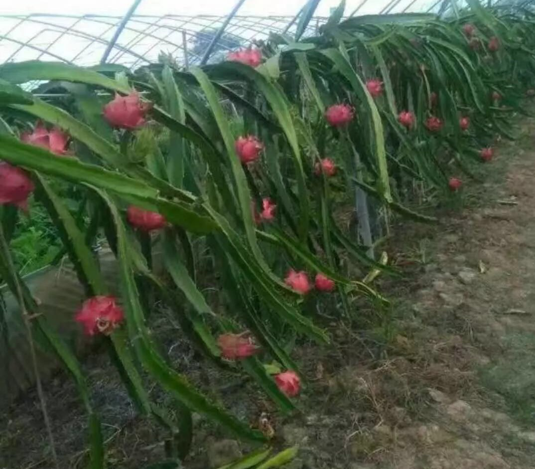 在基地种植老板付彦向我们介绍说,这里的火龙果口感比外地的好很多, 因为光合作用成熟时间长些,真正做到了无农药化肥。他说现在种了20亩,明年计划再扩大一倍。第一年后每亩800斤,两年后每亩达到2000斤,三年后达到2000斤以上,每年从7月份挂果至11月,一年开7次花以上。平时每三亩长期请1个劳力,除草剪枝摘果,到冬天盖膜和开春时取膜人工多点,照顾贫困户的劳动力来做些非常简单的零工,例如人工除草等。现在种植模式是公司加农户的模式,带动了周边农民增收。