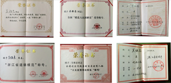 由于他的工作业绩突出得到上级和人民的肯定,先后获得省、市级敬业奉献道德模范、全国司法行政系统二级英模、全国人民满意司法员、全国十大法制新闻人物、全国百名感动中国人物、中国好人、全国模范人民调解员、浙江省优秀人民调解员、浙江省十大优秀司法所长、荣立个人一等功等80多项荣誉称号。连续七年年度考核为优秀公务员。其先进事迹曾被人民网—党建频道、新华网、党建网、光明网、光明网—党建频道、中国纪检监察报、共产党员网、中国网、中国青年网、全国党员干部教育网、中国思想政治工作网、中国党建信息网、浙江日报、浙江在线、浙江组织工作网、七一党建网、丽水日报、丽水市政府网、丽水组织部微信、庆元党建网等多家媒体报道转栽。中共丽水市委组织部、丽水市电视台特拍摄了党建专题片丽水先锋网,2018年5月5日还被“光荣的追寻”栏目组邀请北京录制。