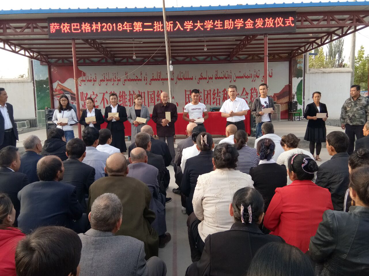 清风网讯 (沙雅县农业局 周鸿) 2018年9月10日上午,正值第三十四个教室季节来临之际,萨依巴格村2018年度第二批困难大学生学费补助发放仪式在该村文化广场隆重举行,全体工作地队员、村两委班子成员、大学生代表、学生家长等共计913人参加了发放仪式。