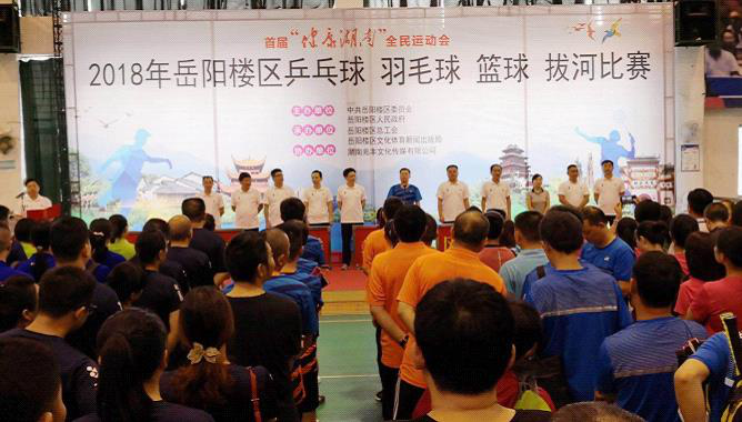 清风网讯( 李磊 郭泰菘)9月8日,岳阳楼区2018年干部职工羽毛球、乒乓球、篮球、拔河比赛开幕式在岳阳市体育馆举行,区委书记陈阁辉宣布赛事开幕,区委副书记、区长黄建文致辞,区领导廖星辉、彭端生、朱彦翼、李峰、王智勇、黎建欣、白铭科、彭飞、陈金星、唐露尧等出席。