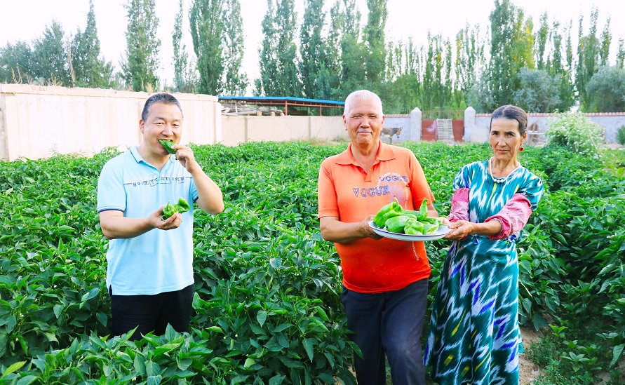 司马义·拜尔地的家,整齐的庭院被分成三部分,生活区、种植区和养殖区,种植区内辣椒、西红柿、土豆、南瓜等各类蔬菜已都成熟,司马义·拜尔地老两口今年靠着这些蔬菜让自己的钱包比那年都鼓了。
